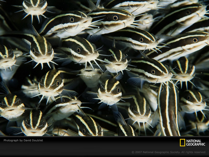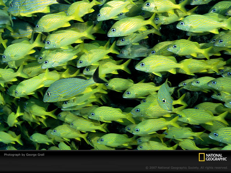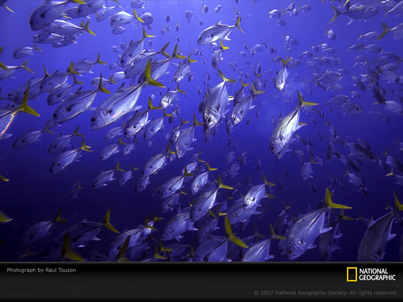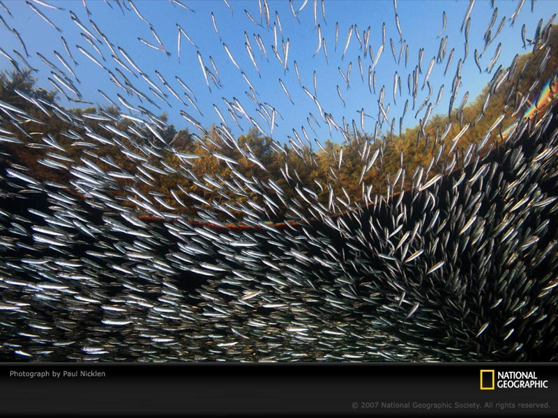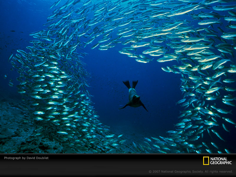 一群鱼尝试以策略制胜对付一只饥饿的海狮在靠近Galapagos岛,鱼群摆成环形去搅乱掠食者。海狮可以潜入120英尺寻食物,回到海面在1~2分钟呼吸一次。
