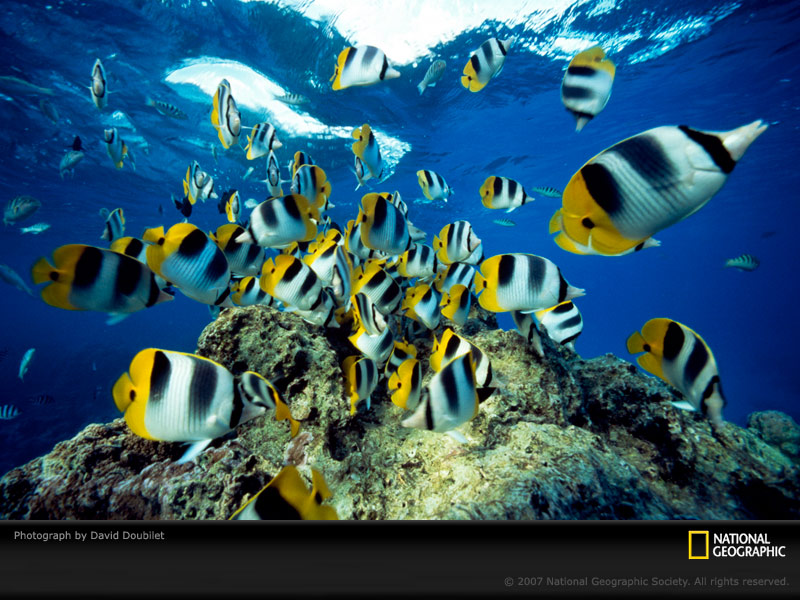表面上大胆的蝴蝶鱼,生活于法属玻利尼西亚群岛巡游在一个珊瑚暗礁周围。它们的鲜艳的彩色和斑纹使得吸引人的蝴蝶鱼放到水族馆,但是需要特别的维护和关注。