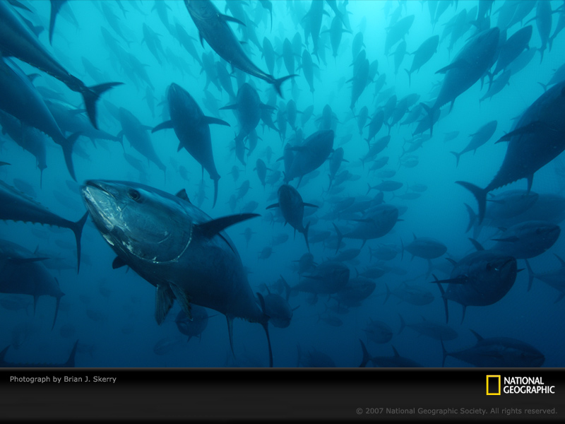 这些笼里的金枪鱼游在西班牙的水中。它们将要长肥再送到寿司(日本生鱼片冷饭团)市场,在那里它们的黄油样的肉类要售得高价。金枪鱼类已经被证实无以伦比的高科技捕鱼产业,那样金枪鱼的数量掉进一个危险的下降。