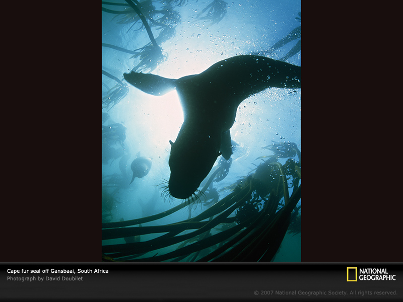 位于南非的Gansbaai海岸之外一只软毛海豹跳入并通过一个巨大的海藻森林。虽然海豹在陆地上是笨拙的,但是在水底下是优美的。海豹巡游在南非海岸和东南澳大利亚一带,吃鱼,鱿鱼,墨鱼和章鱼。