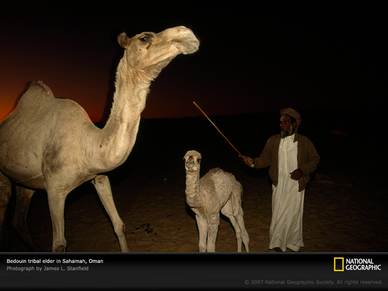 一位贝多因人的老年人照管骆驼队在黄昏时刻在阿曼的Sahamah。阿拉伯的骆驼队,也称单峰骆驼队,已经驯养达到3500年。经过估价这类动物,它们能够负重行走达到每天40公里。