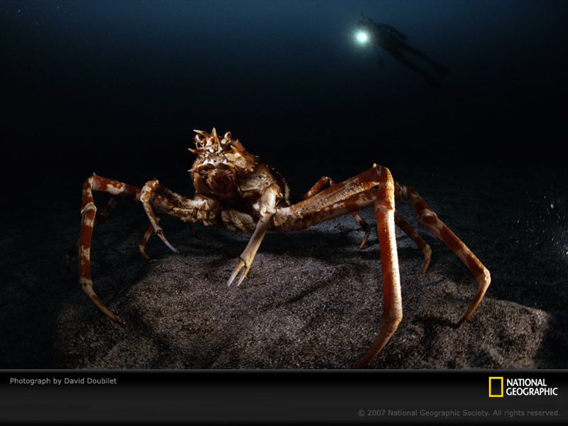 正如沐浴在月光之下,一只大的蜘蛛螃蟹被照亮是一位潜水者的照明灯在日本海洋的公园。它用它的硬壳来保护来自掠食者的侵入,它能够生长到十英尺(三米)大――也能进入海洋的底层。在海底深部保护起来,它能消失海底的海绵之下而其它的海底生物用来装饰它自己的壳。