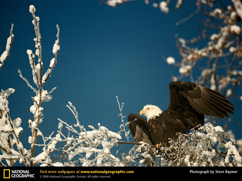 秃顶鹰perches ,翅膀伸展,在皑皑白雪覆盖的树由奇尔卡特河近haines ,阿拉斯加。 该地区是一个秃头鹰保存这是一个总管越冬,为鸟类,吸引了约3000名鹰一年一次。