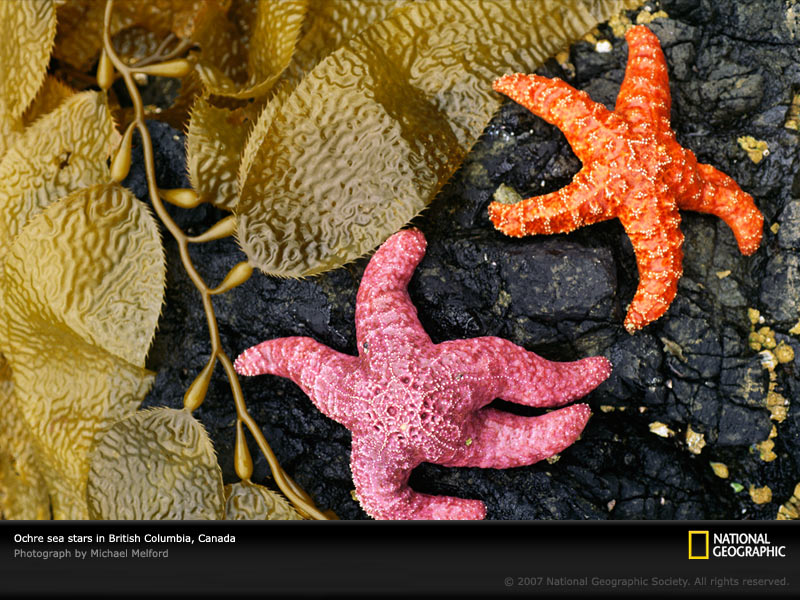 赭石色海星,像这样一对位于纽约湾海峡在皇后夏洛特岛于英国哥伦比亚,通常是紫色但能适应多变的颜色依靠生活环境而定。