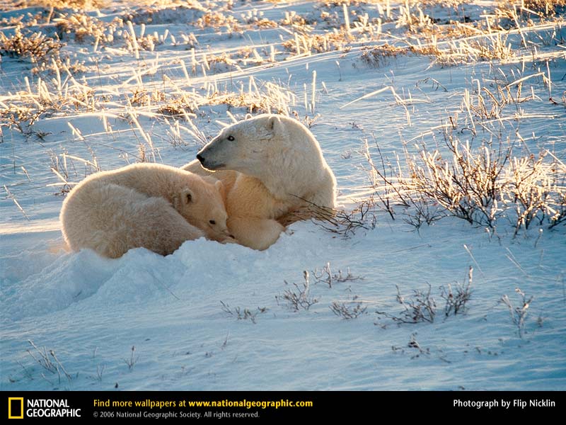 一只北极熊的幼子让它的妈妈知道它要护理。北极熊护理它的幼兽需要二年或一年半需要哺乳而消耗母熊35%的体内脂肪――因此一条安全的毯子准备即将到来的北极寒冬。