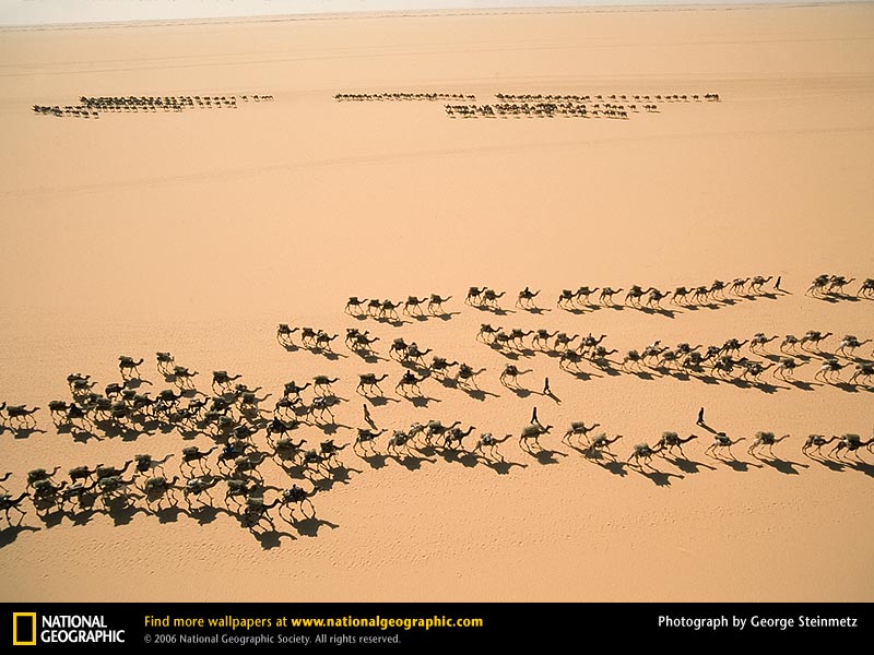 无限延伸的沙是公路撒哈拉沙漠尼日尔。不到500英里(805公里)较大的范围铺平了道路服务于一个民族,它三倍大于加州面积。下面地平线上一沙漠旅行队负责人,到bilma镇采购食盐,珍贵的商品,另一列火车满载着盐和其他贸易项目走向市场,在沙漠的边缘。