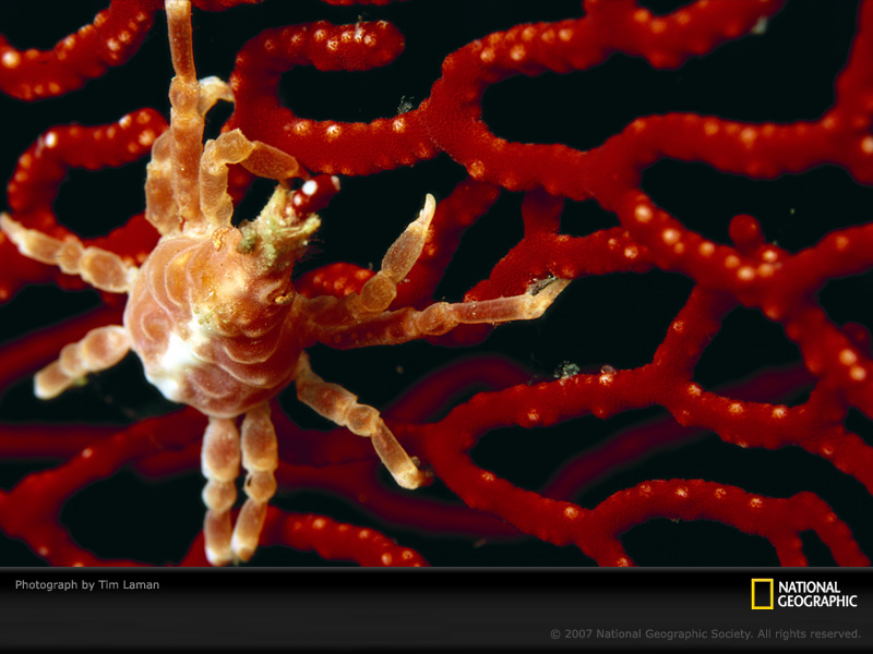 一只螃蟹爬上这个红色的触角海扇在斐济水域。 海扇,也被称为可怕的 ,捉浮游生物在其珊瑚,其中微观动物黄藻,然后转入海扇食物。 海扇还提供住房和伪装暗礁生活。