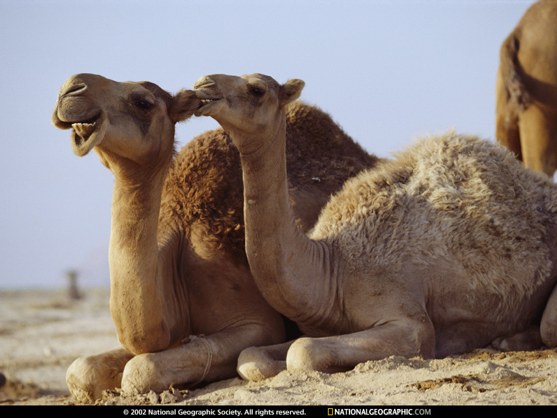 喜欢咬一口?一只单峰骆驼咀嚼在另外一只耳朵。