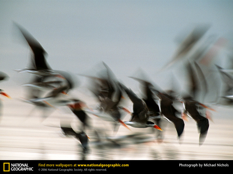 一群非洲skimmer鸟类滑行越过鱼丰富的海域在加蓬的沿海地区。 其独特的发展,下颌骨长得多,比上颌,skimmer鸟类捕食小鱼飞行惊愕得张开大嘴越过表面上的河口和河流。