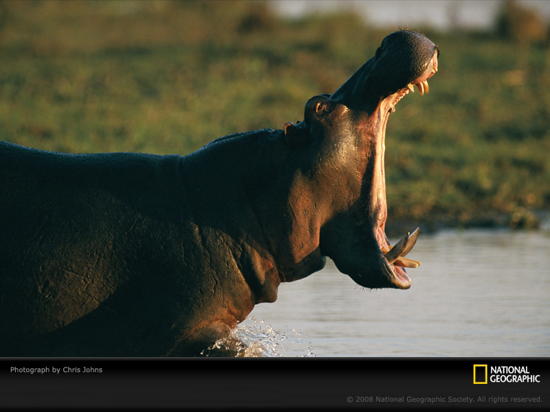 一只张开大口的雄性河马显示其占领土地,就像这只在赞比亚河,外貌大约是打呵欠。
