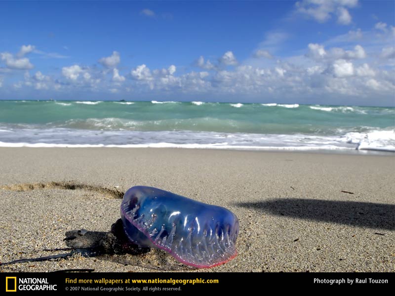 一个葡萄牙僧帽水母躺在佛罗里达州迈阿密海岸