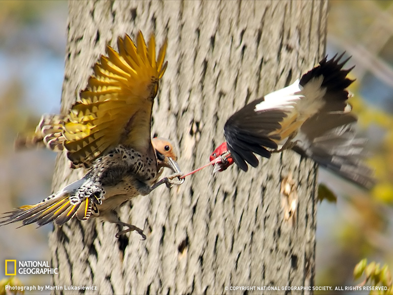 红头啄木鸟尝试驱赶闯入的闪光鸟