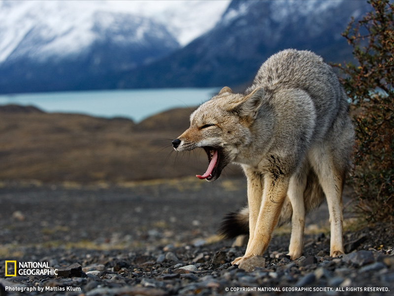 当黄昏降临在智利的桃乐丝del潘恩国家公园,一只南美的灰狐狸打呵欠