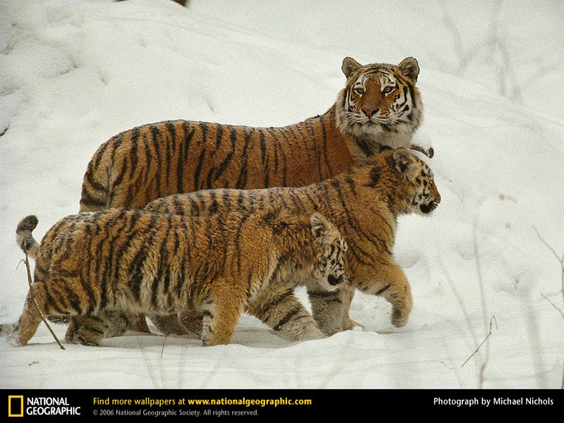 雪地中有三只保持品种的老虎,是西伯利亚的老虎也是虎中最大的。这里仅存400-500只老虎离开野外生活,是为了稳定老虎的数量,保持数量的计划是引进被捕的天生的虎群回归大自然。