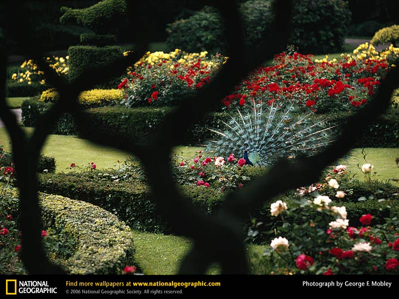 一只孔雀可能在显示自己围绕着花神,大摇大摆地在英国花园并且进入花中之王――玫瑰花丛和修剪过的篱笆。一只孔雀的灿烂的尾部羽毛,或者隐藏起来,构成多于其身体总长度的60%,而孔雀开屏通常是在求爱时展示的造型。