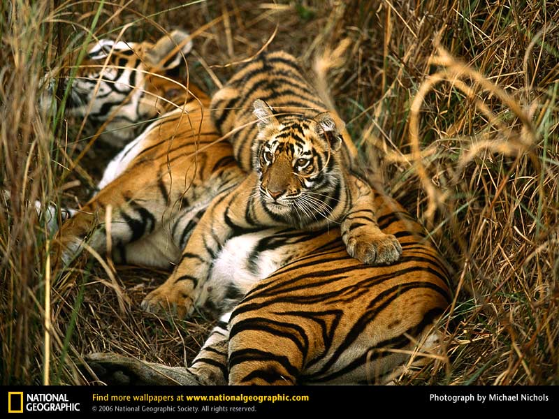 孟加拉的母虎和它的幼虎在茂密的高大的草原休息。幼虎要依靠它的妈妈2~3年后,才能分散外出寻找它们的领地。