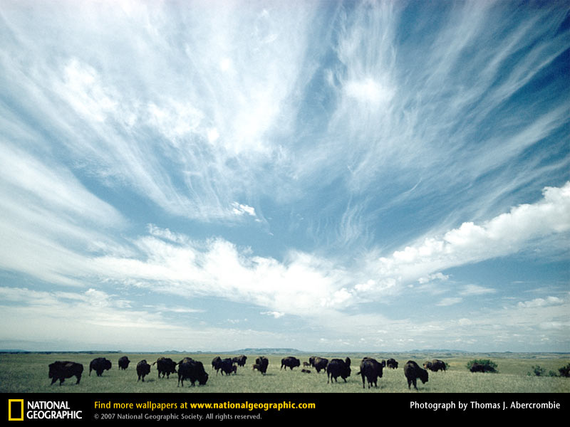 美洲野牛吃草懒洋洋地在北达科他的淡蓝色天空。美洲野牛生活临界于印地安人部落的大草原,野牛群可以用来做各个方面的事情。