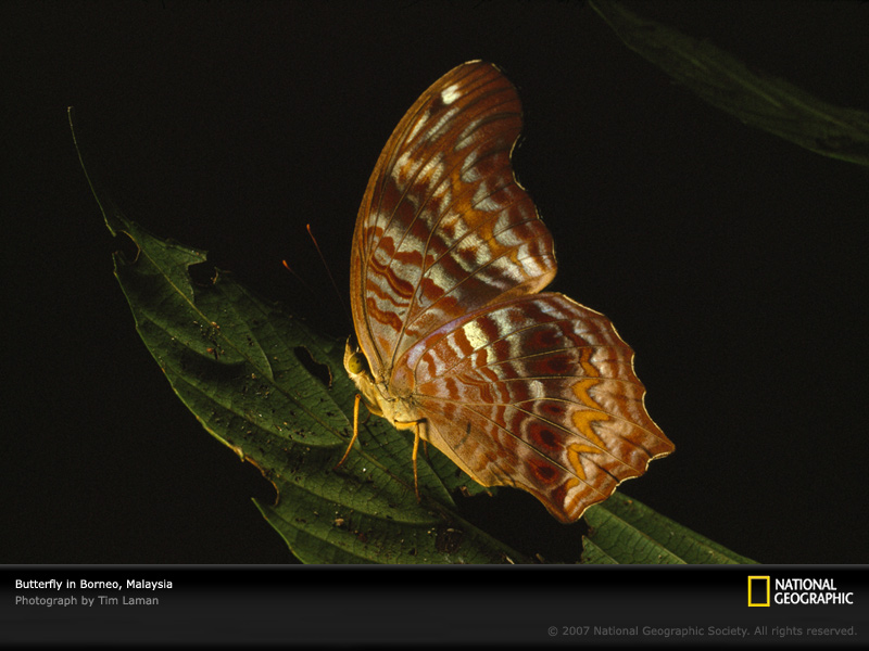 在漆黑的保护下,一只蝴蝶合拢双翅温文地伏在一片叶片上休息,这是位于婆罗州的沙巴州的Danum山谷保存的地区。保存的地区面积达到438平方公里,也是马来西亚一块未受到干扰的陆地雨林,是世界上最大的综合的生态系统家园。