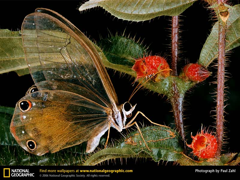 一只蝴蝶的翅膀装饰像窗玻璃那样的透明,它正落在一棵代毛的植物。蝴蝶的颜色上衡量是减少了美丽的毛发,但是使它的翅膀透明度升高,除了四只眼睛像圆点。