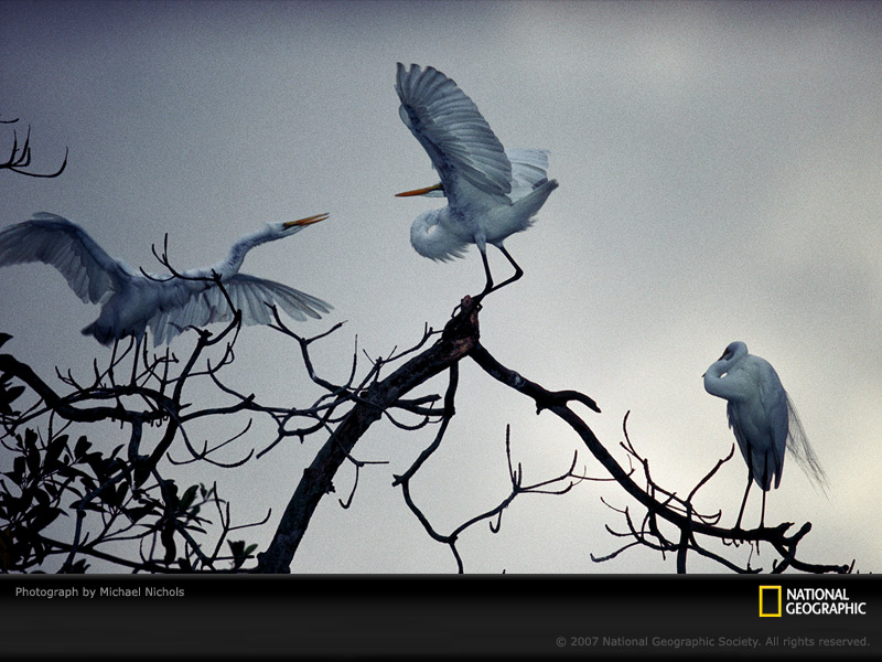 位于加蓬国的Petit-Loango地域,保存三只白鹭落在一颗树上背对暗色的天空。白鹭是长腿会收缩鸟类靠近水域生活,它们可以吃鱼,爬虫类,小的两栖动物,白鹭会用它们的强壮的嘴很快的插进动物中然后将其全部吞入。