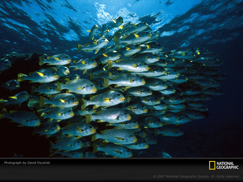 一群海鱼名叫Sweetlips能很快的移动在澳大利亚的大堡暗礁。它们经常和清道夫濑鱼做伴。一条鱼张开口允许这些小鱼进入口中清除那些会传染疾病的寄生虫。
