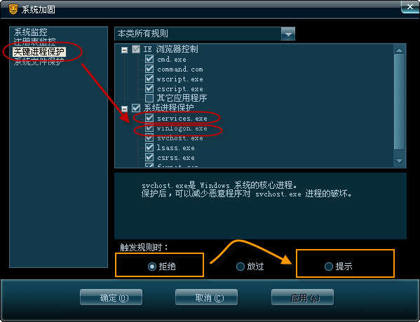 打开杀毒软件或全功能软件,设置,防御设置,系统加固,自定义级别,关键进程保护,将services.exe和winlogon.exe两个规则中,触发规则时的动作改为询问。再次运行V3时,杀毒软件会进行提示,选择放过即可正常使用。