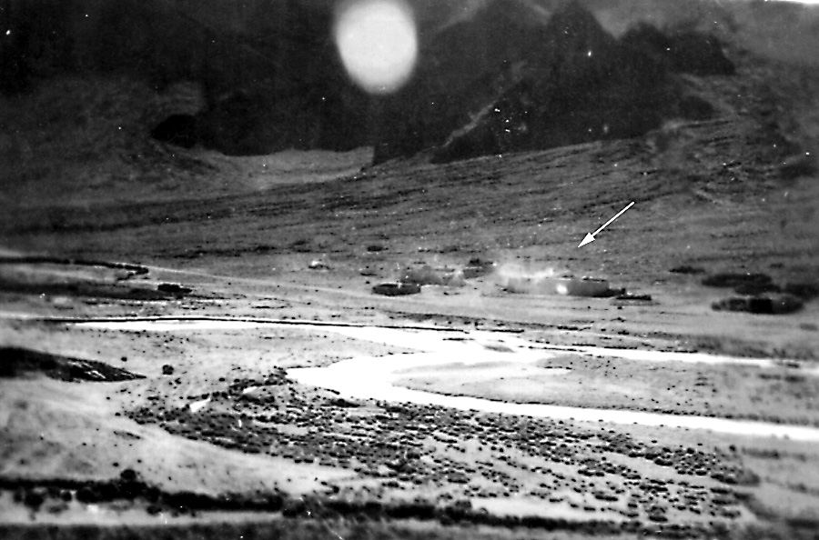 噶尔昆沙(原阿里专署所在地,1963年才迁往狮泉河的):照片上部是岗底斯山,山脚箭头所指是藏族民居,中部