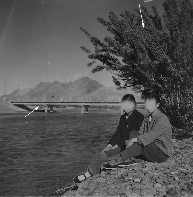 箭头所指是狮泉河茂盛的红柳和狮泉河大桥。