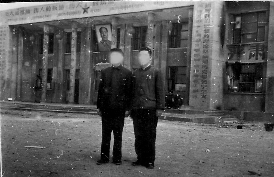 人物背后是在整座山上用石头砌成的巨大的“毛主席万岁”标语,十分壮观,几十里外都能看见。