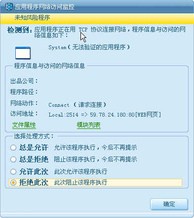 第一种是System,没有路径,但是文件属性是rising文件夹的,当时我还以为是病毒呢,就拒绝了,昨天一天没有弹出这个框了