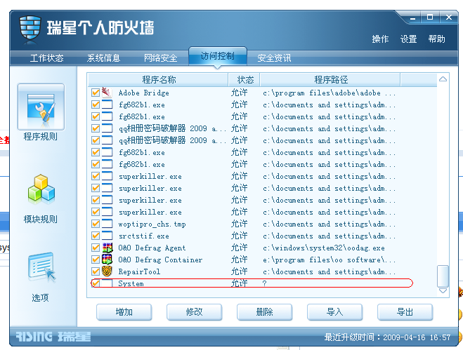我的情况和楼主一模一样,system进程不停地试图访问网络。昨天我记得访问的是北京的一个IP,刚才想关机前又出现了,是杭州的两个IP,而且有几个用的是80端口,其中某个是2023端口,被提示是某个木马所使用的端口。这下可让我紧张了,但是瑞星无法查到病毒,而且卡卡安全助手的进程管理里也是看不到这个SYSTEM进程。