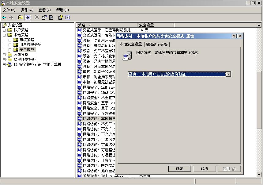 4. 本地帐户的共享和安全模式为“经典-本地用户以自己的身份验证”模式,这个在哪里设置啊?:default1: