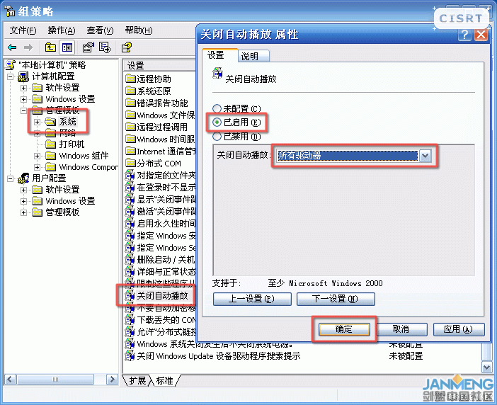 接下来在右侧找到“关闭自动播放”项目,双击它打开“关闭自动播放属性”对话框,点选“已启用”,然后在下方“关闭自动播放:”中的下拉菜单里选择“所有驱动器”,最后点击“确定”。