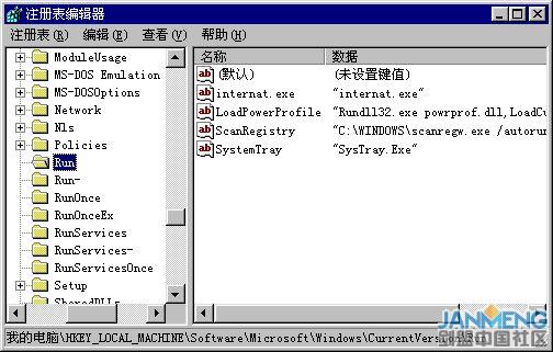 由“开始->运行”,输入regedit,确定就可以运行注册表编辑器。再展开至:“HKEY-LOCAL-MACHINE\Software\Microsoft\Windows\CurrentVersion\Run”目录下,查看键值中有没有自己不熟悉的自动启动文件项目,比如netbus、netspy、netserver等的单词。注意,有的木马程序生成的服务器程序文件很像系统自身的文件,想由此伪装蒙混过关。比如Acid Battery木马,它会在注册表项“HKEY-LOCAL-MACHINE\SOFTWARE\Microsoft\Windows\CurrentVersion\Run”下加入