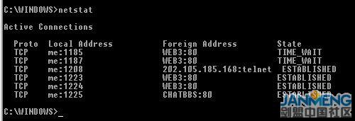 由“开始->运行”,输入command,确定,开一个MS-DOS窗口。或者由“开始->程序->MS-DOS”来打开它。在MS-DOS窗口的命令行键入“netstat”查看目前已与本计算机建立的连接。如下图所示: