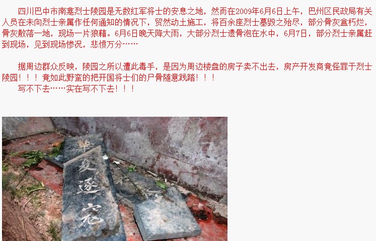 综上所述,巴中市巴州区烈士陵园的维修改造是按照烈士陵园改造的有关规定实施的,不存在烈士墓“毁之殆尽,骨灰散落一地”的情况,绝大多数烈士亲属对烈士陵园的维修改造表示支持和拥护。网友“燕南大巴山”所发《黑手伸向烈士陵园 红军尸骨惨遭破坏》贴文严重失实。