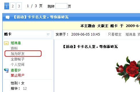 入口2:帖子显示页内,点击用户昵称,在下拉菜单中点击“加为好友”