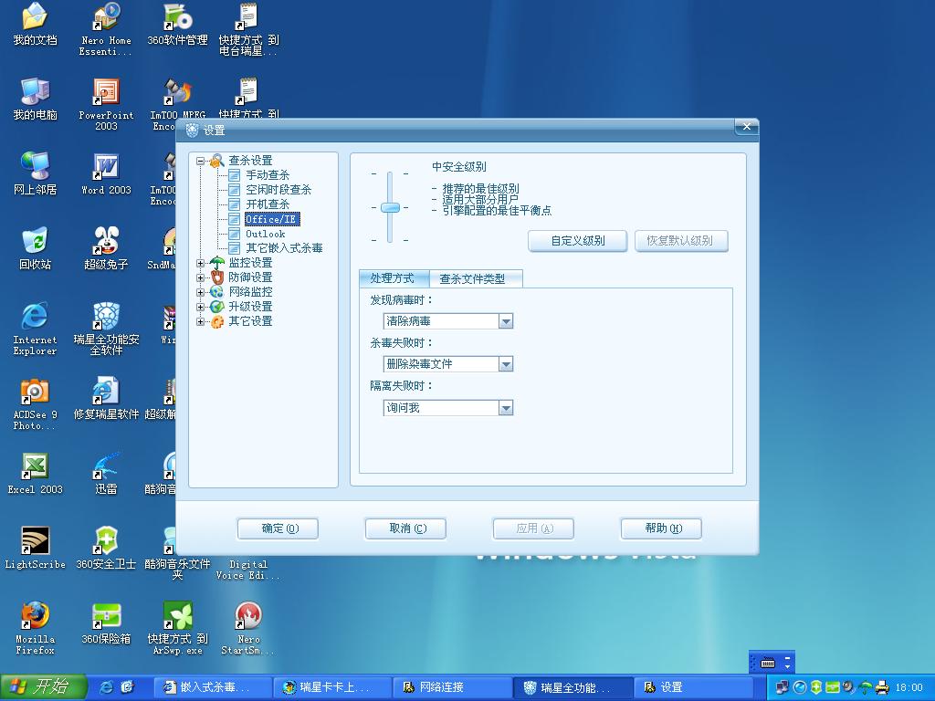 在杀毒软件设置菜单的详细设置,然后查杀设置将嵌入式杀毒设置成你想要的