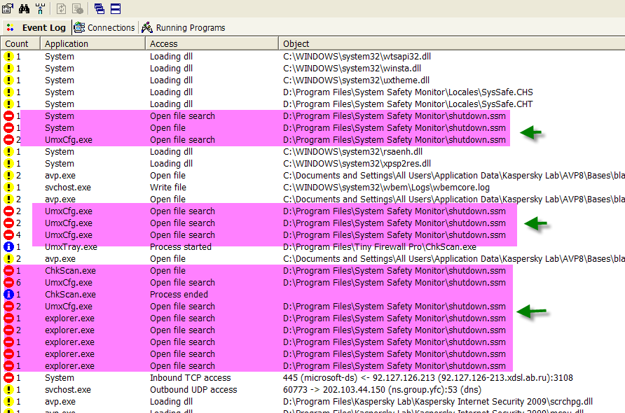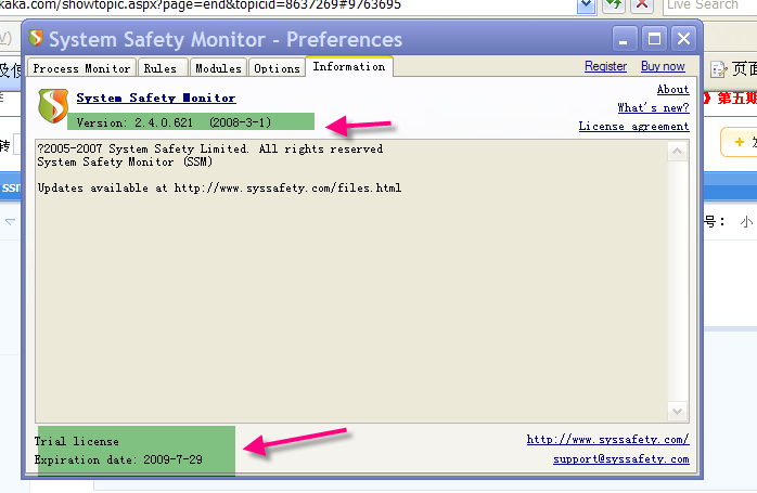 从病毒,木马,等恶意东西上仔细找过原因,似乎与那些无关;也反复查找了同机装的tiny,Kis-2009,以及ssm自身的设置与规则,及系统的组策略的设置\规则是否有冲突,但都没找到原因和解决办法,最后,只好用tiny的文件保护设了一条规则:禁止并记载任何东东对这个"shutdown.ssm"的访问\写入及删除等!结果,问题解决了一半:ssm自行挂掉的那个提示还是不时出现,不管点送不送"报告"它即退出(挂掉),但只需重点其快捷启动图标或任何途径,它又恢复如初,无需整个重装了!