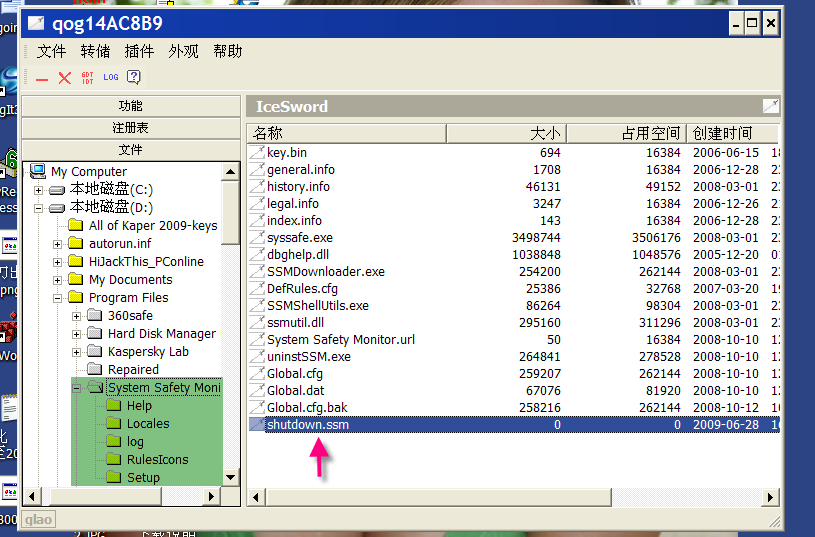 我想知道的是:1,你们的tiny也有这个文件么? 2,它的功用及运作机理?从tiny观察看,光顾它的程序也就是tiny的,卡巴的某些例行的"巡视"程序,加上"系统"("system"),而ssm的开机加载似乎都是"system"进行的,而每次由"system"调动这个shutdown.ssm而关掉SSM似乎也顺理成章,只是在什么条件下才出现这种情况?是系统不能访问那个破解的键值而引起的吗?