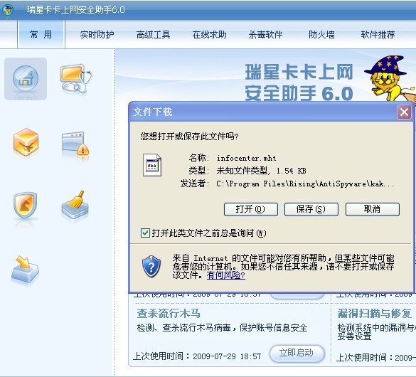 首页 » 个人产品讨论区 » 瑞星其他产品 » 瑞星安全助手 » 卡卡上网安全助手 » 这是为什么啊,一打开卡卡就出现N多的叫保存或者取消一个未知的下载装置