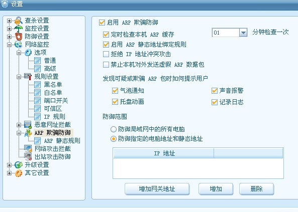 软件右上角 设置---监控设置---网络监控---ARP欺骗防御--取消相应提示