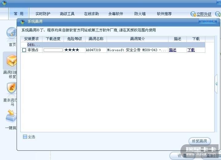 刚才把卡卡升级到6.0.1.57最新版,KB952069问题解决,但是KB947319漏洞仍然打不上,卡卡扫描漏洞仍然存在。