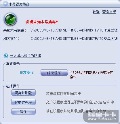 运行病毒文件后,瑞星主动防御弹出驱动加载和系统文件替换的提示,但是病毒插入IE进程成功(建议瑞星将进程插入纳入拦截范围)。奇怪的是,第一次运行病毒木马行为防御不报,只有第二次才报。瑞星版本:22.00.00.71.