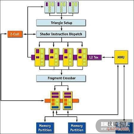 另外,NVIDIA还在6200TC核心中加入了MMU(内存管理单元),它的作用就是允许GPU无缝的分配或者不分配系统内存,并且高效的读取内存。而且MMU管理性能非常强大,可以线性访问系统内存,存储包括纹理缓存、深度缓存、色彩缓存等数据,并且大幅度提高内存的利用率。在NVIDIA的驱动程序中,也针对TC技术进行了相关的修改,使之能够智能化的确定彩色渲染、纹理填充和Z轴缓冲数据的准确位置,也使得GPU的处理能力大大提高。
