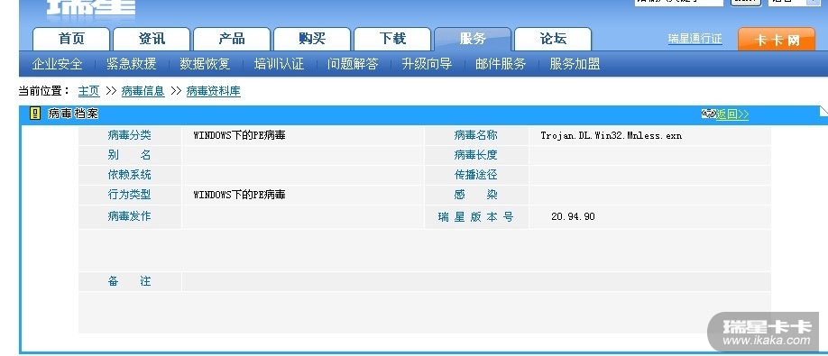 Trojan.DL.Win32.Mnless.exn 这个是个什么病毒呀??瑞星杀了7次每次都能查出来 但是就是杀不掉他。 不晓得对电脑会有什么影响吗? 瑞星病毒库里也找不到这病毒的信息 ,百度也搜不到,瑞星只是说是说明Windows下的PE病毒,也不晓得什么意思,关键不知道这病毒对电脑的影响大不大,出了系统重装还有什么比较有效的方法能方便的删除这病毒吗。。 我网上搜了下,用的360安全卫士强制删除这病毒文件,可是一强制删除就蓝屏,试了2次都这样。希望对大侠们都来看看教我解决下问题。。。。谢谢各位了!!!!!!! 我把附件传上来看下吧