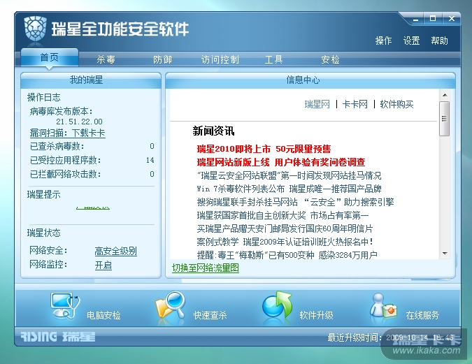 我的瑞星是正版注册过的 但是最近不知道怎么了 病毒库版本升级不了了(只是显示升级不了了)我每天都是升级和杀毒的 但是瑞星杀毒的首页显示的病毒库版本跟我的升级(目前版本)显示的不一致 开机杀毒向导也显示是最新的病毒库版本 郁闷~~~图在下面 谁能告诉我是怎么回事 谢谢