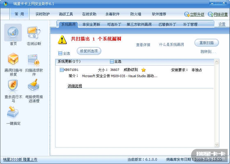 楼主扫描出的那一个是系统漏洞,我敢保证楼主的非安全更新还有三个,这个不是BUG,是你没有看到而已。系统漏洞旁边不是还有非安全更新吗。