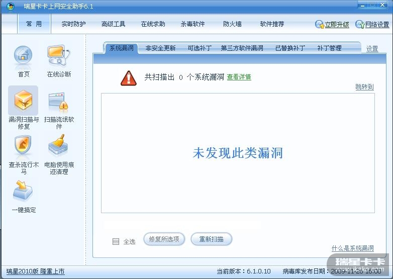 卡卡的漏洞扫描功能并不是windows update的翻版,也就是说,卡卡的漏洞扫描功能只扫描安全更新和瑞星认为对安全有帮助的系统补丁和第三方软件漏洞补丁。