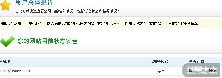 我的网站www.95666.com,今天莫名其妙有人和我说,被瑞星列为不安全。我加入了联盟,挂了检测代码,也没发现有问题,希望解封!